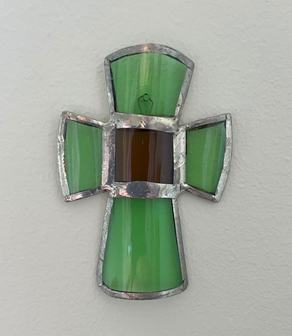 I fødselsdagsgave fik jeg et lille kors i grønt og brunt buet glas, der nu hænger på min væg. Umiddelbart ser det ikke ud af så meget, det er ikke unik kunst eller specielt imponerende. Men historien bag det er både unik, imponerende og rummer hele påskens drama med Jesu korsfæstelse langfredag og den efterfølgende opstandelse påskedag, samt vores menneskelige erfaring af, at livet kan gå i stykker og på forunderligste vis opstå i nye former. Påskens budskab bliver vi aldrig færdig med at forstå.