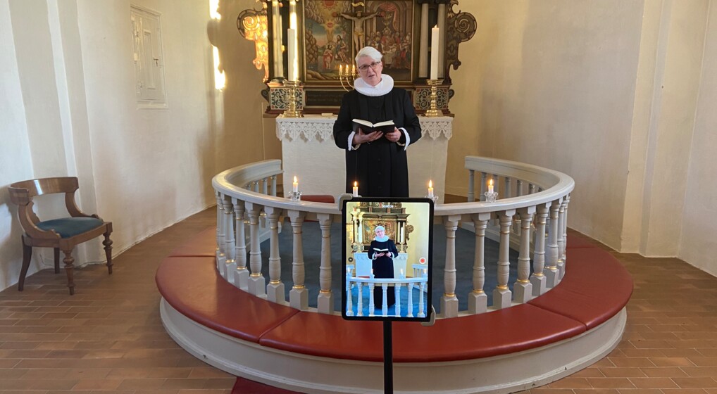 Mange kirker livestreamer gudstjenester, mens der er coronarestriktioner. Her er det sognepræst Lizet Jane Wendt fra Horslunde-Nordlunde Pastorat. Arkivfoto.