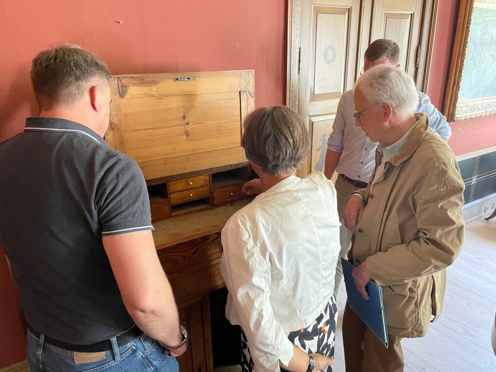 “Det ser jo ud som om, den altid har stået her. Den passer ind her i Monrads stue. Og når vi i forvejen har Monrads stol stående her i rummet, så der er et eller andet over, at skrivepulten nu også er tilbage igen. Det passer sammen. Så det er dejligt, at den er kommet hertil igen,” siger hun.
