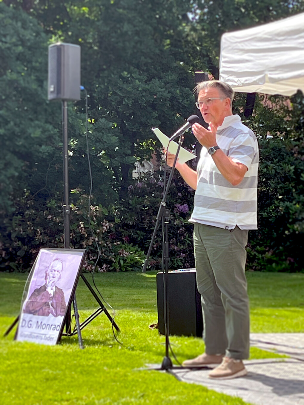 I bispegårdens have holdt Christian Schou, forstander på Højskolen Marielyst og fhv. debatvært på DR P1, en fængslende grundlovstale i det gode vejr.