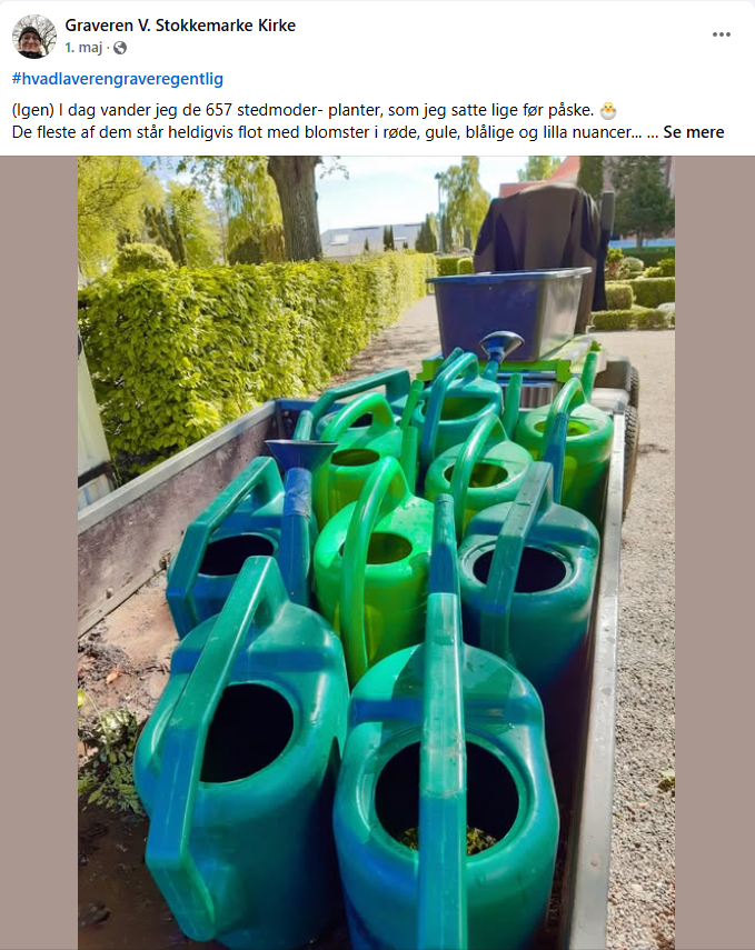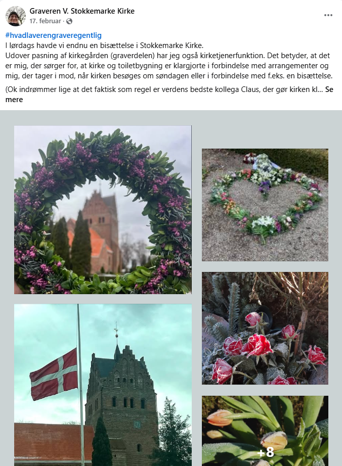 ”Jeg reposter også indimellem ting fra folkekirken.dk, hvis det mere generelt passer. Sidste år lavede de fx et tema om sorg, og det giver jo virkelig god mening at tale om på kirkegården, siger hun og forklarer, at hun har hashtagget #HvadLaverEnGraverEgentlig for dem, som kun vil læse om arbejdet på selve kirkegården.