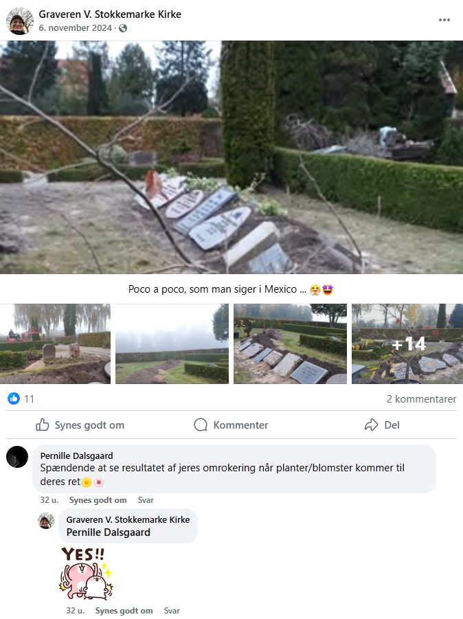 ”Så Facebook-kontoen handlede fra starten om at oplyse om, hvad vi rent faktisk gik og lavede, om forandringerne, før de fandt sted, og forandringerne, når vi havde lavet noget nyt. Håbet er på den måde at skabe en større forståelse og måske i endnu højre grad skabe et tilhørsforhold til kirkegården.”