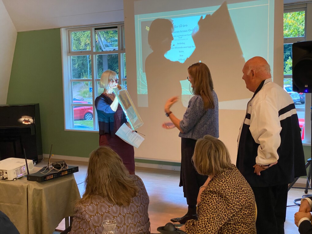 Her overrækker stiftsrådsformand, Susanne Møller, prisen - et kunstværk af Anne Gyrithe Smith, til sognepræst Ida Støckel Rolle og et medlem af menighedsrådet i Nysted.