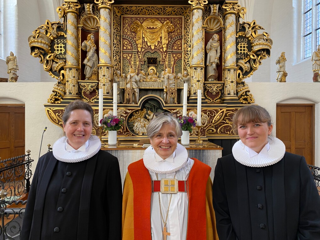 Biskop Marianne Gaarden flankeret af Anna Steenberg Gellert (tv) og Caroline Augusta Underdal Jacobsen (th)