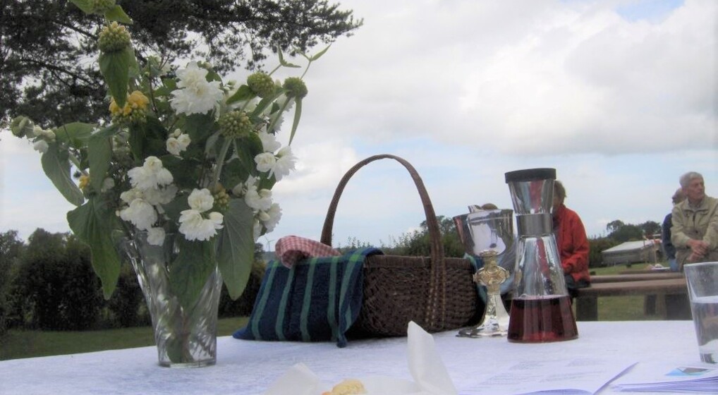 Nadver står klar på bordet med dug og blomster ved møllegudstjenesten.