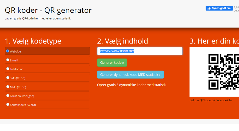 I dette tilfælde lader vi QR-koden henvise til www.lfstift.dk. Derfor går vi ind på denne hjemmeside: http://www.qr-koder.dk/ og indtaster stiftets hjemmeside i feltet midt på siden. Klik derefter på "Generer kode", og der vil dukke en ny QR-kode op ude i højre side.