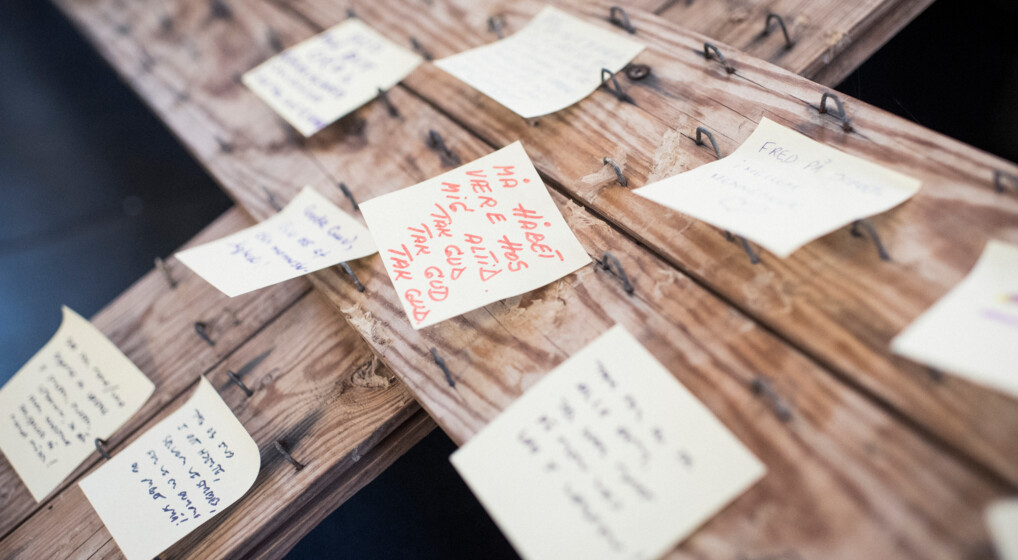 En af de måder, man kan bede på, er ved at skrive en bøn på en lap papir, som her ved en stiftsgudstjeneste i november. Foto: Iben Gad.