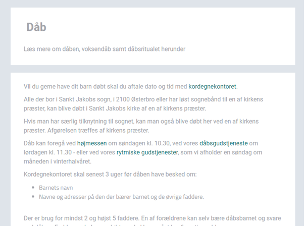 Selv om en potentiel dåbsfamilie i Nordborg gerne vil læse jeres gode valg af dåbssalmer, vælger de nok ikke at døbe deres barn i jeres kirke, hvis den ligger i Langeskov på Fyn. Det kan derfor være en god ide at skrive sin kirkes navn og by i sin sidebeskrivelse og titel, så ens besøgende på forhånd ved, hvem I er. Det er altid godt at få forhåndsafstemt med brugeren, inden de trykker sig ind på jeres side. Det gjorde man eksempelvis i nedenstående tekst omkring dåb i Sankt Jakobs Kirke på Østerbro i København.