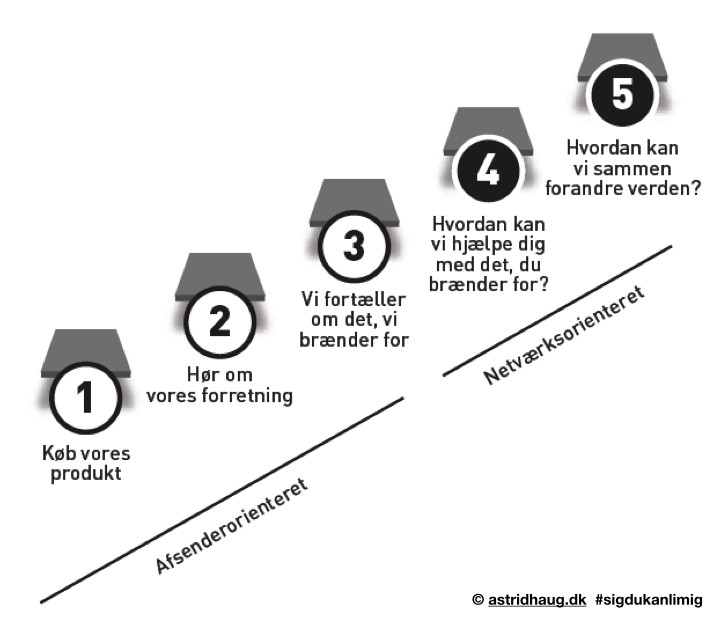 Astrid Haug taler i sin bog ’Sig du kan li’ mig’ om et alternativ til afsenderorienteret kommunikation, som hun kalder netværksorienteret kommunikation. I stedet for at tale om vores arrangementer, opgaver og interesser, skal vi melde os ind i den fælles samtale, der allerede finder sted i samfundet.