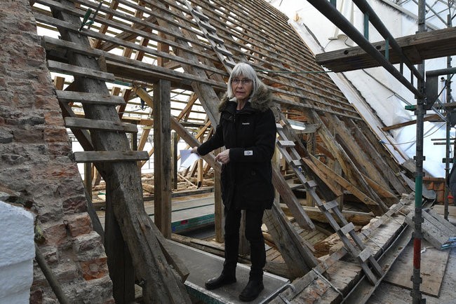 Stiftsrådsformand Susanne Møller på et kirkeloft.