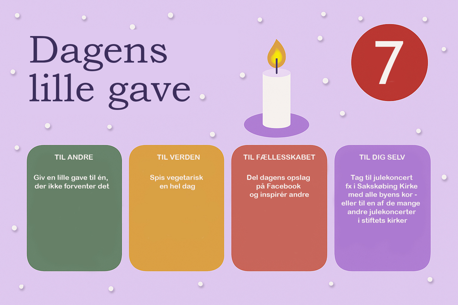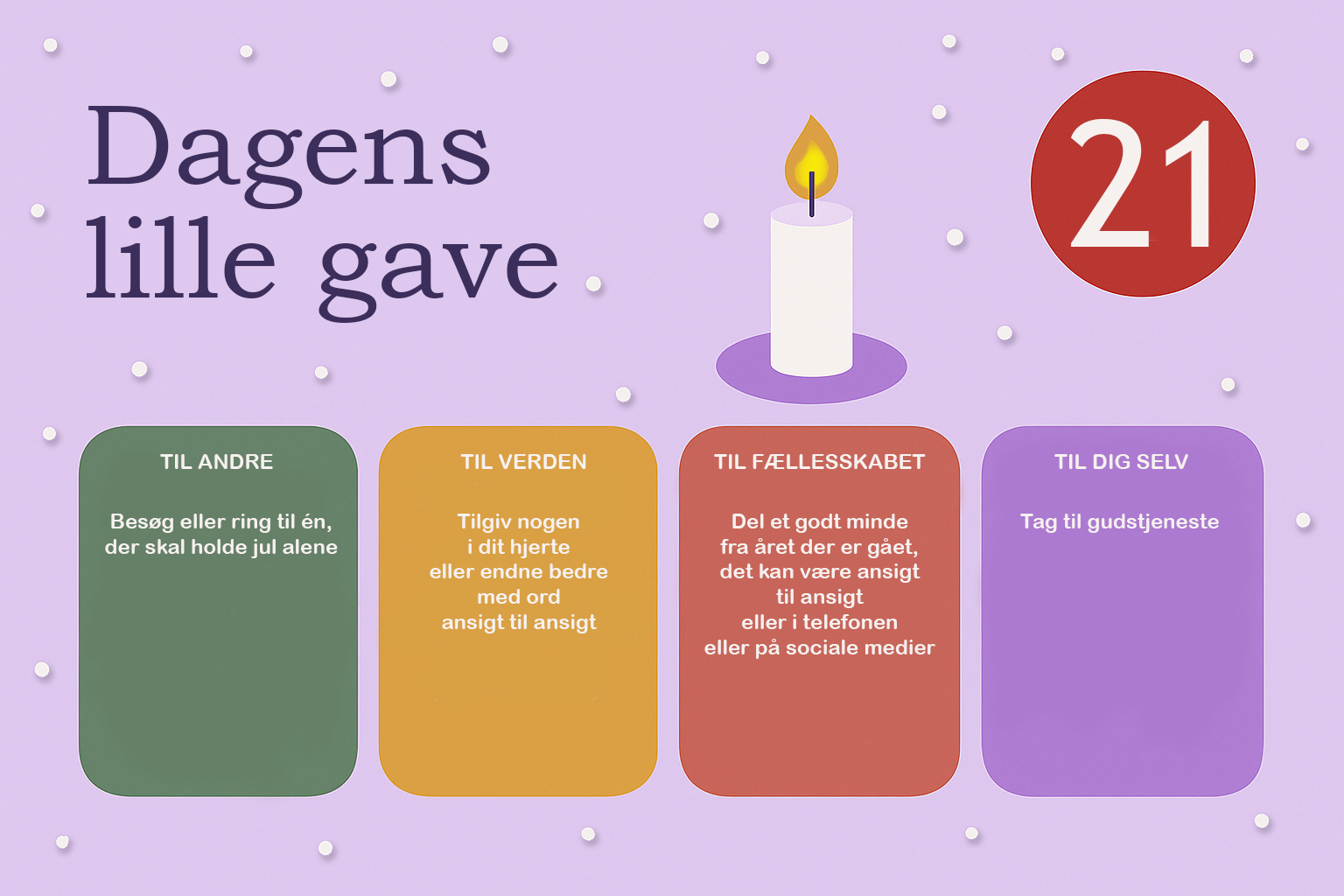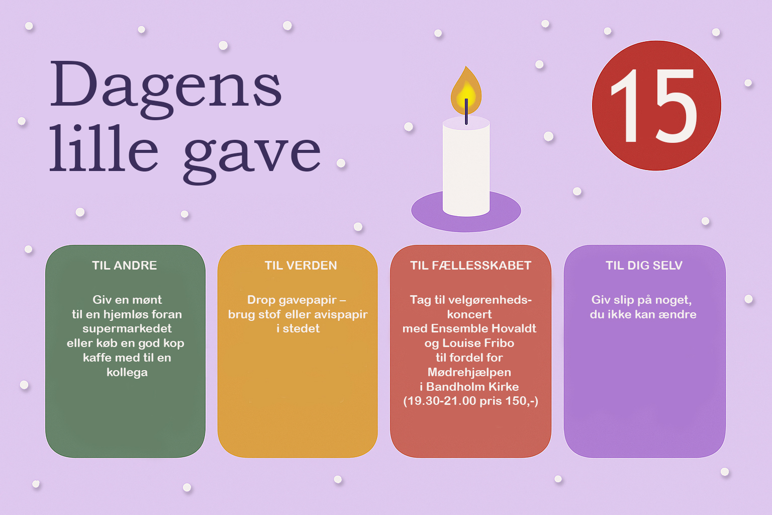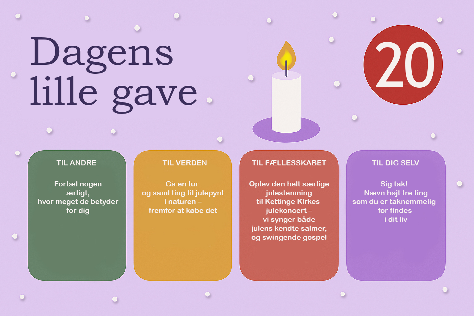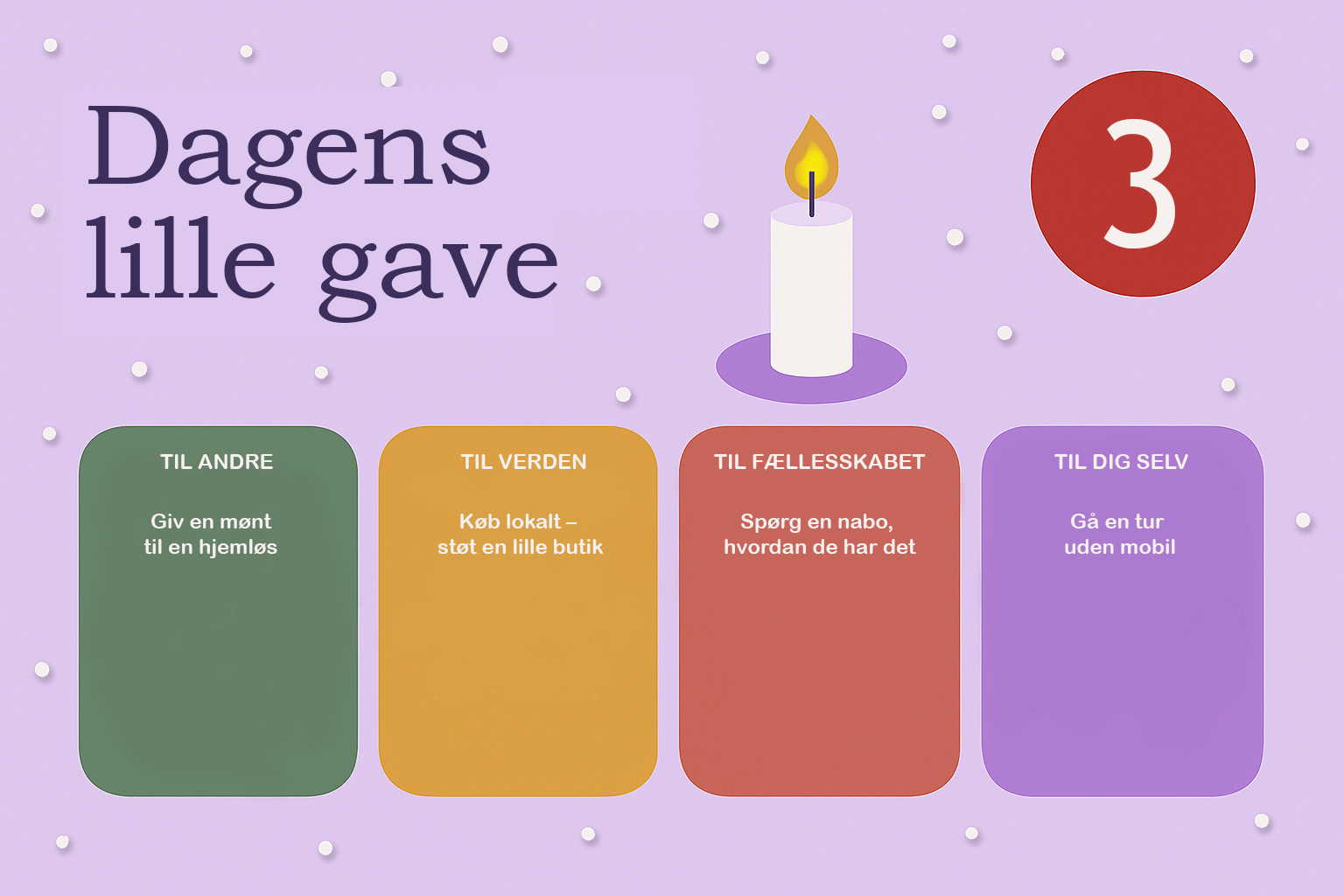 Hver dag i december bringer vi en lille opfordring – en gave, du kan give til andre, til verden, til fællesskabet eller til dig selv. Næstekærlighed begynder ikke i det store, men i det nære. I et smil, en tak, et øjebliks opmærksomhed. Håbet er, at vi sammen kan gøre december god for flere – én dag ad gangen.